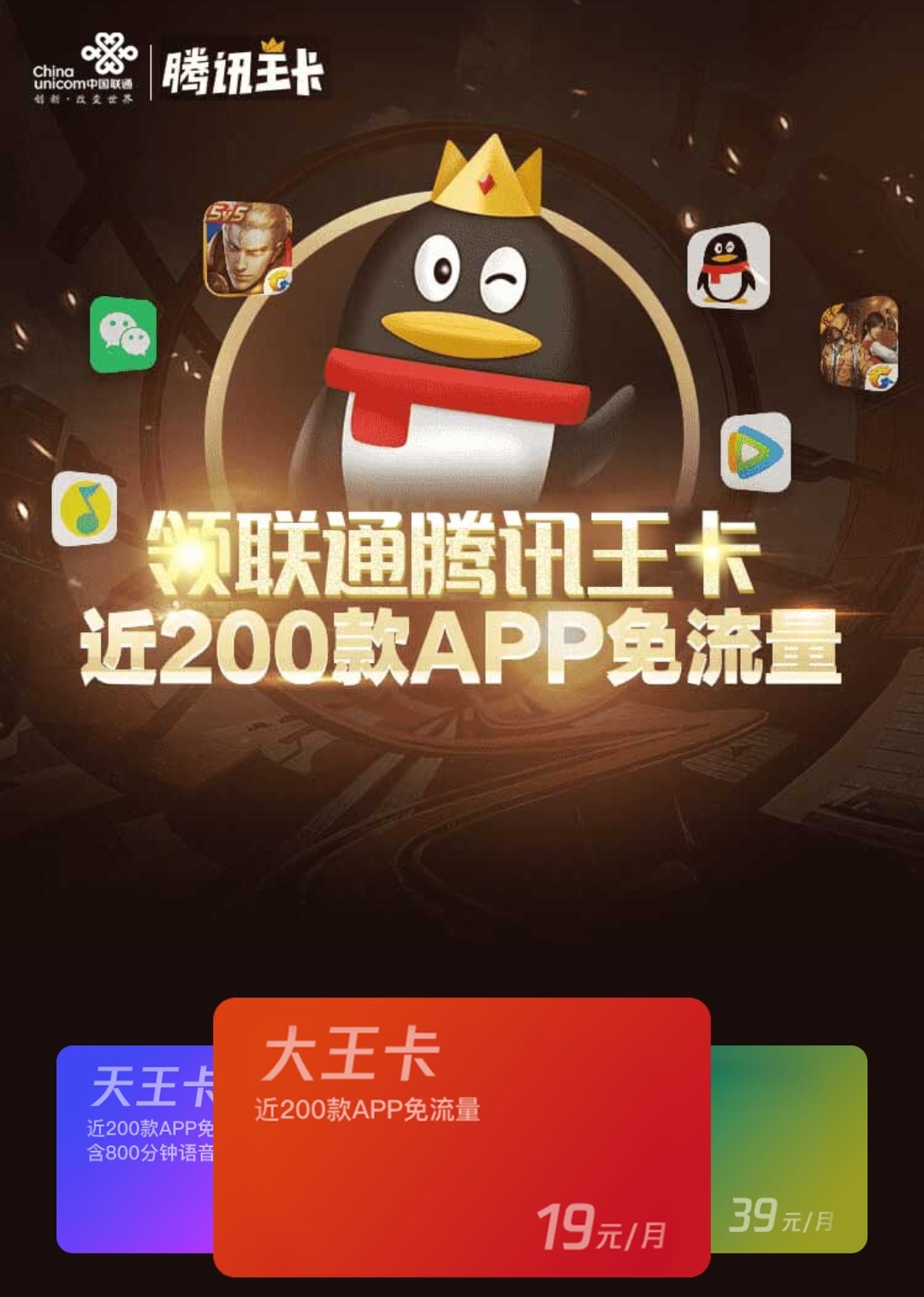 一、腾讯大王卡比较适合游戏党,市面上所有主流的游戏都有腾讯系:微信、手机QQ、腾讯视频、QQ音乐、应用宝、腾讯手机管家、QQ浏览器、腾讯新闻、王者荣耀、和平精英、穿越火线、QQ飞车、腾讯合作第三方(快手、京东、美团、小红书)等腾讯大王卡APP免流详情:也比较适合做销售的朋友,因为只有大王卡微信免流量,打电话还便宜,不用了,注销也很方便,直接中国联通APP注销就行了。而且大王卡发货极快,上午申请,如果证件合格,下午就会送到。主要缺点就是抖音不免流,只有快手免流。